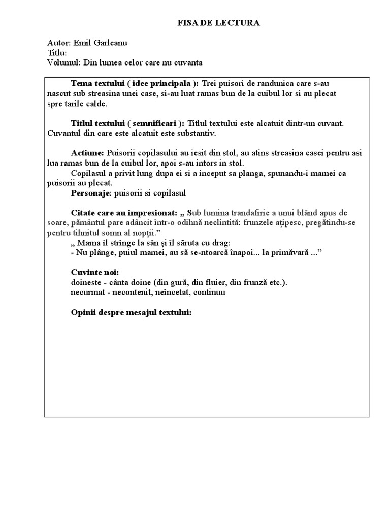 Un colb de argint dă strălucire stufărişului. Nu simţise nici durere, nici bucurie. Vrei să fii la curent cu veștile literare? Imbogatirea si actizarea vocabularului prin activitatile de tip scolar. Ea il iubeste pe puiul ei din tot sufletul dar isi da seama ca a venit vremea intarcatului.