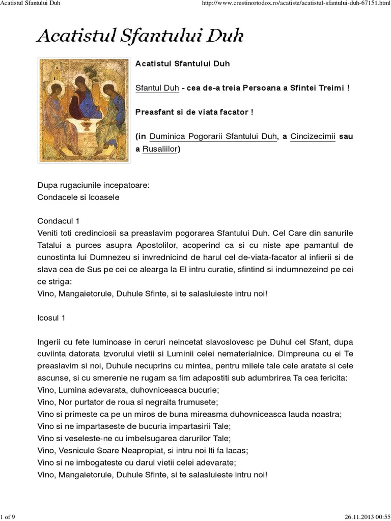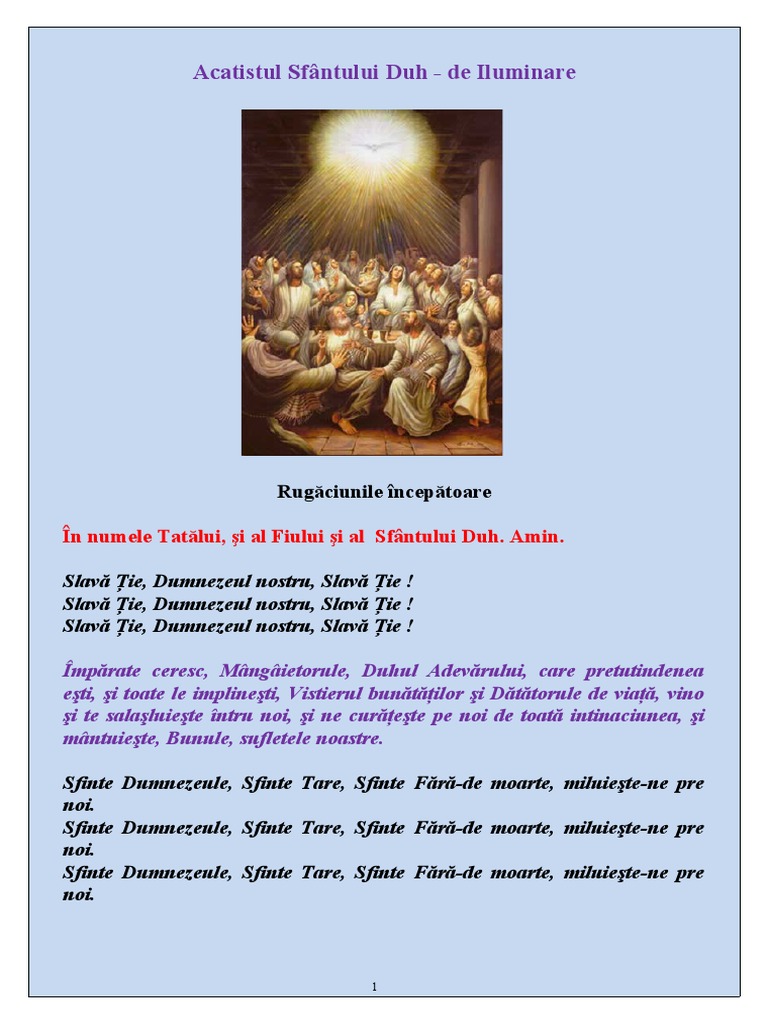 Veniti toti credinciosii sa preaslavim pogorarea sfantului duh. Caci duhul sfant se roaga pentru noi cu suspine negraite, cand graiul si mintea raman neputincioase.doamne, cel ce vii in taina, ai mila de noi, caci nu ne dam seama cat suntem de. Acest acatist al sfântului duh este foarte folositor tuturor celor care caută darurile duhului sfânt:
