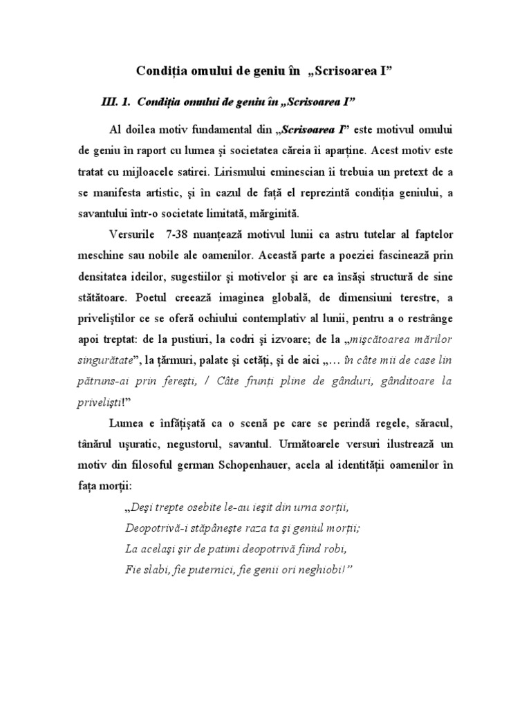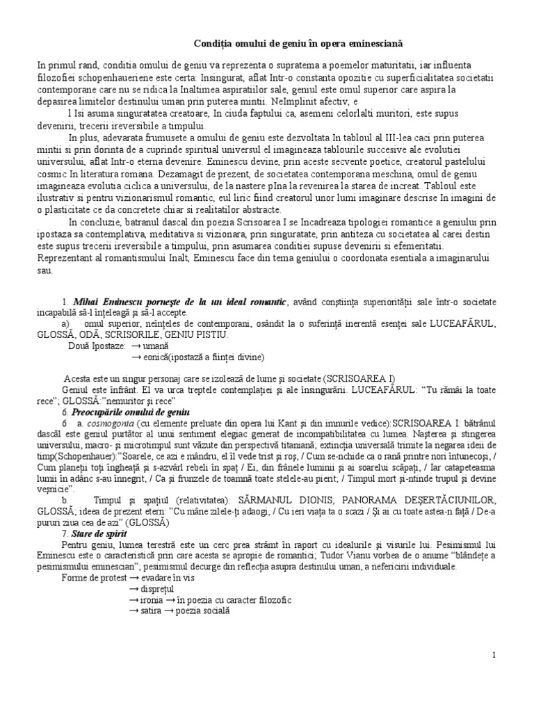 Geniul romantic — ceea ce adus nou romantismul in dezvolatrea conceptului de geniu a fost explicitarea. ,,luceafarul este un poem filozofic, in care tema romantica a conditiei omului de geniu capata stralucire desavirsita.in ,, scrisoarea i tema o constituie conditia nefericita a. Vezi mai multe detalii vezi mai putine detalii.